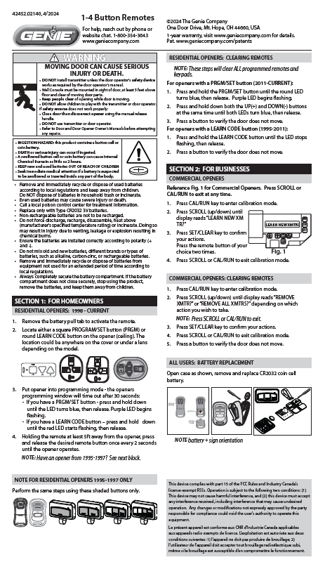 This new style Genie 3-Button Garage Door Opener Remote, is designed to make your life more convenient and secure. This sleek and modern remote is compatible with all Genie garage door openers manufactured since 1996, ensuring it works seamlessly with your existing setup. With the ability to control up to three Genie garage door openers, it's perfect for households with multiple garage doors. Plus, it features Genie’s Intellicode secure rolling code technology, which automatically changes the access code with each use, providing an extra layer of security to protect your home.